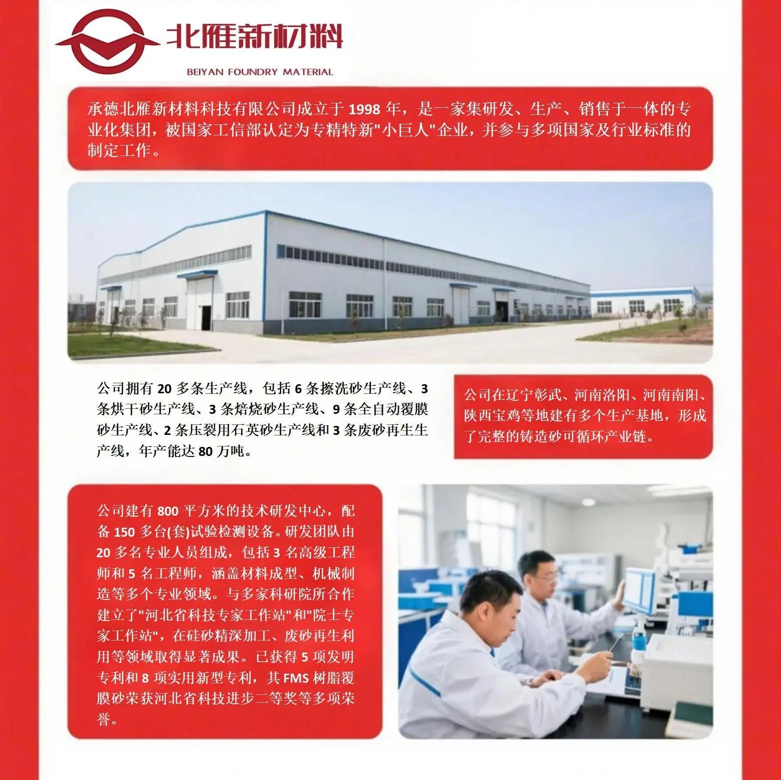 承德北雁新材料科技有限公司成立于1998年,是一家依托河北围场县丰富硅砂资源发展起来的高新技术企业。经过二十余年的发展,公司已成长为集研发、生产、销售于一体的专业化集团,被国家工信部认定为专精特新"小巨人"企业,并参与多项国家及行业标准的制定工作。